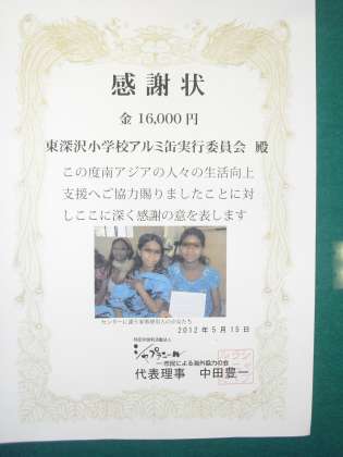 アルミ缶回収で集まったお金は、シャプラニールを通してバングラディッシュにお送りしています。このたびシャプラニールよりその功績を認められ「感謝状」もいただきました。この活動は20年以上も続いています。これからもアルミ缶回収にご協力ください。アルミ缶実行委員会の皆様にも感謝いたします。