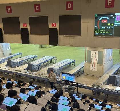 3年生の社会科見学、午後は世田谷市場を見学させていただきます。セリの会場に座り、お話やビデオで説明していただきました。