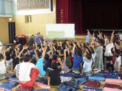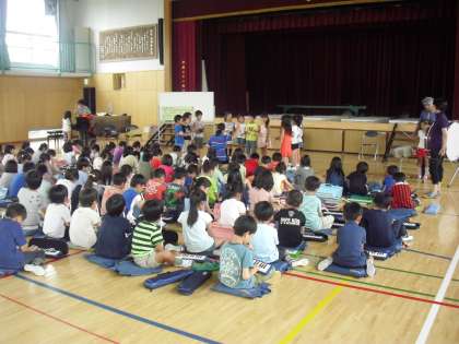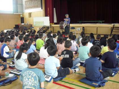 山本三郎先生をお招きしての講習会も今年で4年目。87歳とは思えない元気溌剌の先生による、優しくも厳しさのある講習に、1年生の子どもたちも真剣な眼差しで取り組みました。時折奏でられる先生の演奏には心を奪われ、バッグから取り出される様々な楽器には大喜びし、カエルの木魚が出てきた時にはびっくりして・・・。あっという間の2時間でしたが、最後にはドレミの音階を鍵盤ハーモニカと様々な楽器とで合奏を行い、楽しく時間を過ごしました。