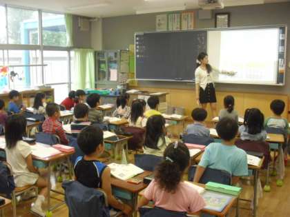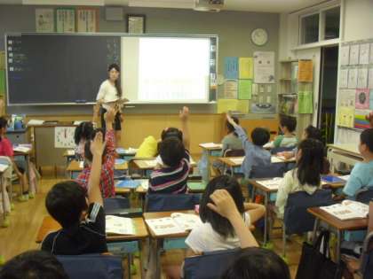 2時間目に1年生の国語です。「ちいさい ゃゅょが つくことばを よんだり、書いたりしよう」です。いろいろな言葉を見つけていきます。ノートにもきれいな文字で書きます。