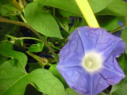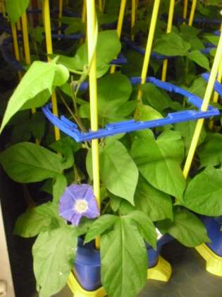 1年生の朝顔は、先日の台風や今日の大雨の被害を受けないように教室前の廊下に置いてあります。その朝顔の鉢から一輪のきれいなお花が咲いていました。夏が近づいています。