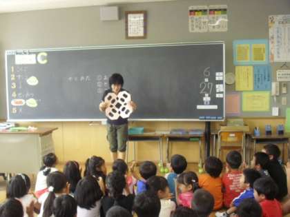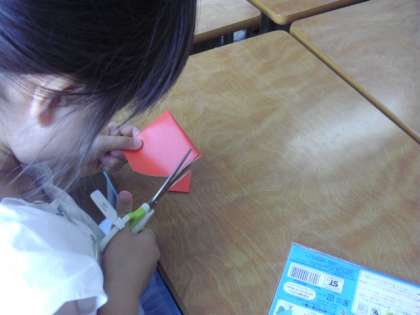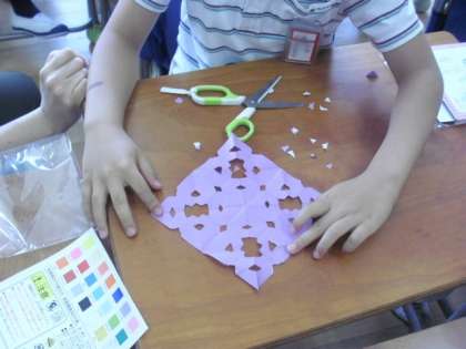 2時間目は1年生の図工です。「チョッキンパでかざろう」は、折り紙を折って、ハサミで切り模様を作ります。とてもきれいな模様ができました。とってもすごいのは、作業をしても床を汚さないことです。石井先生のおっしゃることを良く聞いているからです。素敵な作品をこれからもたくさんつくってください。