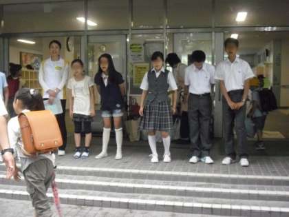 6月から始まったひがしの子どもたちによる「あいさつ応援隊」の活動は、7月になったので5年生が今日から校門であいさつをしています。