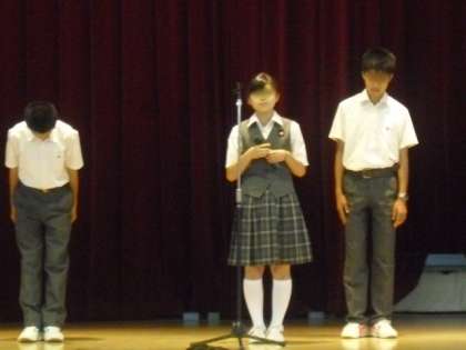 今朝は、東深沢中学校生徒会の3人の生徒が来校し、全校朝会でみしまの森学舎として行う2つの活動を小学生に紹介しました。1つ目は、明日・明後日と生徒会がひがしのあいさつ活動に参加することです。2つ目は、今年も東日本大震災復興支援の募金活動を行うことです。募金活動は、5日(木)・6日(金)に行われます。