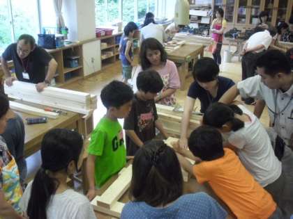 「夏休みにみしまの森学舎のワークショップを開きましょう。」と東深沢中学校・等々力小学校・東深沢小学校の学校運営委員さんたちの話し合いから実現したのが、今日の「みしまの森学舎ベンチプロジェクト」です。3校の子どもたちが、ベンチを制作し町の公共施設に設置しようという趣旨です。(設置場所は未定です)