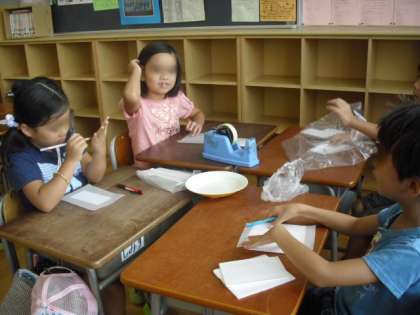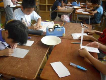 とても楽しく自分だけの宝物ができました。自分の宝物を暑中見舞いに使うのもいいですね。(2年佐藤・鎌田)