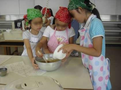 炊飯器を使って、チョコレートケーキを焼きました。ホットケーキミックス・チョコレート・牛乳・卵・砂糖・ココアなど材料がだまにならないように気をつけて、どんどん混ぜていきます。