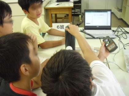 まず、第1の実験では、白熱電球・蛍光灯・LED電球のそれぞれの明るさ・温度・使う電気の量について計測しました。初めて使う電子温度計や照度計を交替で使いました。そして富士通「スマートコンセント」を使い、パソコンに使用電力をグラフにして表すことで、普段目で見ることがない電気の量について考えることができました。