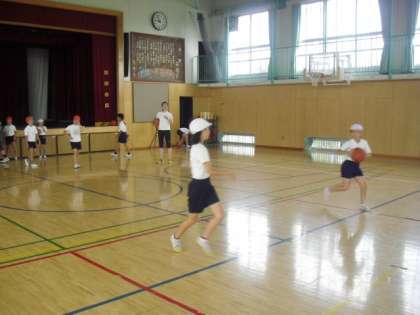まずは、パス練習から。相手の胸へ取りやすいパスを投げるチェストパスです。内回転がつくと相手はより取りやすくなります。最初は、なかなか回転をかけられなかったけれど、だんだん上手にできるようになりました。