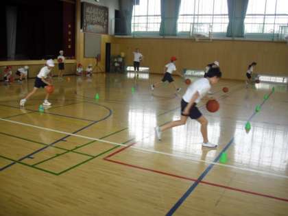 ドリブル練習。てのひらではなく、肩でドリブルをするのがポイントです。その場で50回練習したら、直線でドリブル練習。その後は、カーブでドリブル練習をしました。