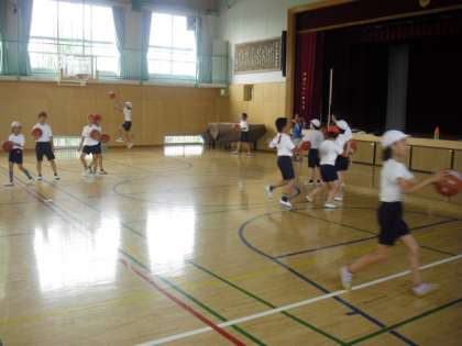 次は、動きながらのパス。2人でコートの端から端へパスでボールを運びます。リードパスをするのがポイントです。相手の走る先を予測してパスができるようになると、上手にボール運びができてきます。トラベリングにも気をつけながら練習しました。