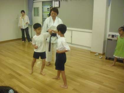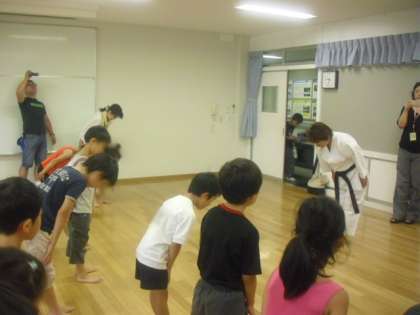 「エイッ!」「八ッ!」と、気合を入れて中段突きを練習する子どもたちの表情は、真剣でとても頼もしく見えました。とても貴重な体験になりました。