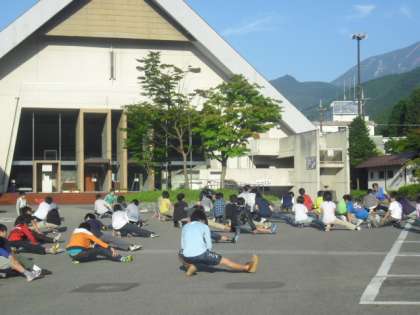 寝不足やちょっと体温が高めの子どももいますが、全員そろって朝会を行いました。