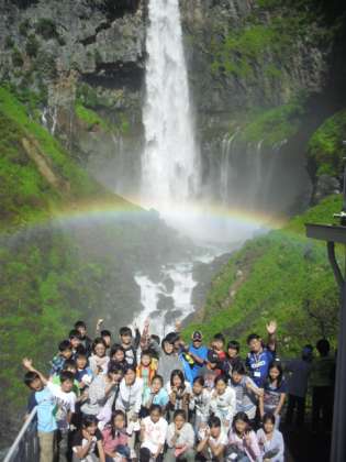 朝1番の華厳の滝です。滝に虹がかかって「きれい〜」という声も。