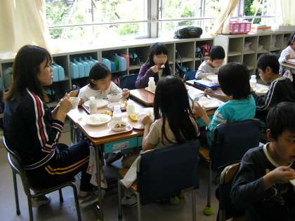 3年2組の給食の様子です。先生もグループに入って楽しく会話をしながら給食を食べています。先生との会話ははずみ、給食もよりおいしくいただけます。