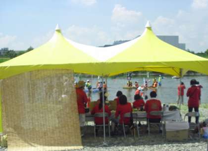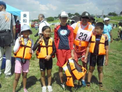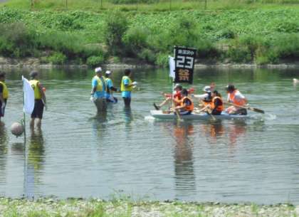 ゴール付近で到着を待っていると「祭り」の姿が見えてきました。おやじの会の坂井さんが率いる6年女子1名・5年女子2名・4年男子1名のチームが見えてきました。息のそろった見事なオール使いです。最後まで乱れることなく安定していかだはゴールしました。