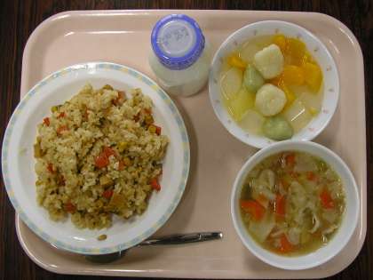 今日の給食は、中華おこわ・牛乳・ワンタンスープ・抹茶白玉入りフルーツポンチです。