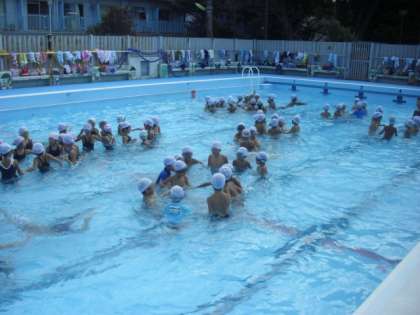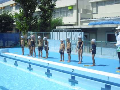 初めて25mのプールで泳いだお友達もいたことと思いますが、広いプールにも慣れ、みんな、先生方の指示を守りながら楽しく安全に泳力を伸ばしました。夏休み中の水泳指導に全部出席したお友達もいました。