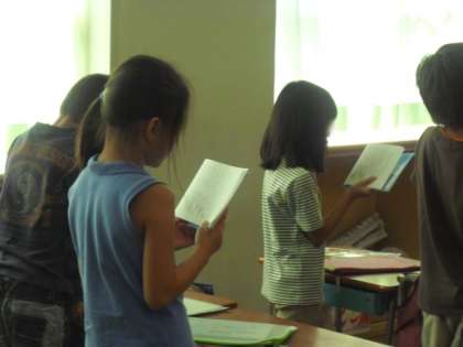 2年生は、読み聞かせの後、朝の会の中で音読集を用いて音読をしていました。音読は毎朝、続けられています。