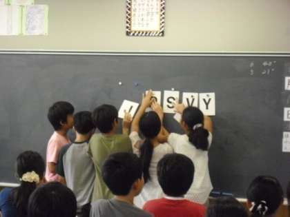 「アルファベット並べ替えゲーム」は、各班6枚のカードを、その名の通りアルファベットの順番に並び変える速さを競いました。最高記録は、11秒でした。Good job!