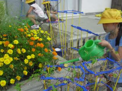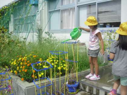 1年生が一生懸命に花壇の花に水やりをしています。嬉しいです。