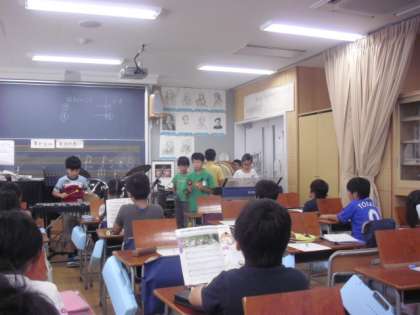 1年生は正しい姿勢で学習に取り組んでいます。4年生は合奏に力が入ります。