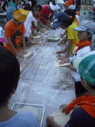 ピザの具材は、チーズ、ウィンナー、タマネギ、ピーマン、ツナ、コーン、マヨネーズです。2種類のピザができます。