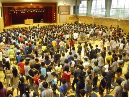 63回目の誕生日を迎えた「ひがし」の今日の朝は、開校記念日集会で始まりました。学校関係者評価委員会の與名本さん(本校卒業生)、学校運営委員会の河野さん、原口さんもいらしてくださった中、代表委員会の子どもたちが中心となって会を進めました。