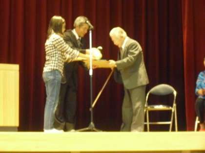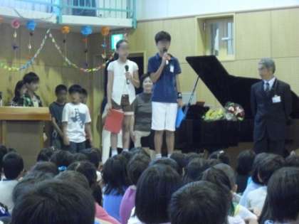 代表によるはじめの言葉の後に、校長先生が、63年の歴史を簡単に紹介に続いて、校長先生から地域にお住まいの橋本さんと、川又さんへの感謝状の贈呈とインタビューへと移りました。橋本さんは、約30年間も子どもたちとあいさつを交わしながら、登校の様子を見守ってくださっています。川又さんは、約10年間もチャボの餌を届けてくださっています。お二人とも長年にわたり、子どもたち、そして、ひがしのために力を尽くして支えてくださっています。本当にありがとうございます。