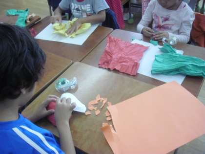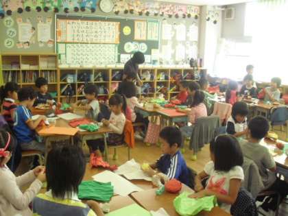 1年3組は図工です。用紙をくしゃくしゃにして工作をします。