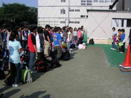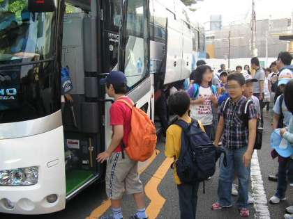 すばらしい青空の下、5年生が元気に川場村へ出発しました。7時15分集合、「○班6名そろいました」と班長が人数を確かめて出発式が始まりました。飯ごう炊さん、勤労体験、ハイキング…川場村ならではの体験を大いに楽しんできてください。準備や朝早くの見送り、ありがとうございました。