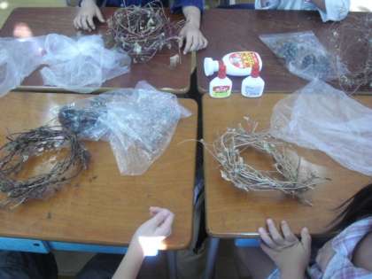 1年生は生活科で育てた朝顔のつるを利用してリースを作ります。
