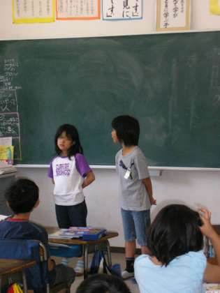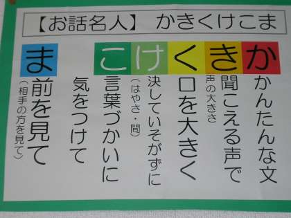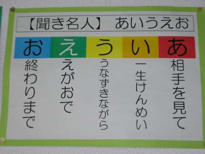子どもたちの「話す」「聞く」力をつけるために、今年度も昨年度に引き続き国語科の研究をしています。自分のしたことや感想などを簡潔に話すことを目標に、朝のスピーチが行われています。教室の前に掲示してある「聞き名人 あいうえお」や「お話し名人 かきくけこま」は、スピーチのときだけでなく、どんな学習にも役立ちます。