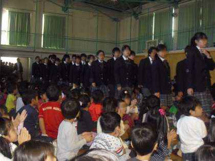 中学生の先輩たちは、さすがです。堂々とした態度で、美しいハーモニーを響かせていました。その歌に、ひがしの子どもたちは、聴き入っていました。先輩たちに対し、「すてきだな」「あんなにできるようになるんだ」など、あこがれの気持ちをもったことでしょう。