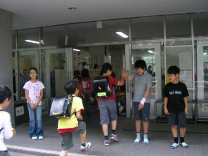 今日から計画委員の子どもたちが、昇降口に立って登校してくる友達に「おはようございます」とあいさつする、「あいさつ運動」が始まりました。今日の当番は5年生です。登校してくる友達への「おはようございます」は、ちょっと恥ずかしそうでした。何回も声をかけているうちに、声も堂々としてきました。頭を下げてあいさつするときもあれば、ハイタッチでおはようございますもあります。