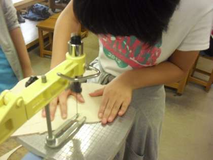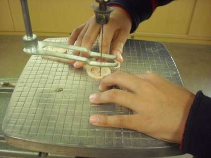電動糸のこを使って、下絵の線に沿って、板を切っていきます。