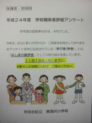 締切日を11月19日来週の月曜日とさせていただいております。より多くのご意見をいただき、学校の教育活動の改善につなげていきたいと考えております。ぜひご回答いただき、担任までご提出いただけますよう、ご協力をよろしくお願いいたします。