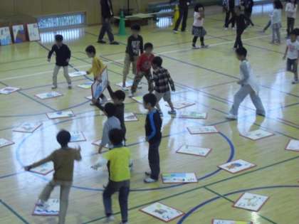 そして、午後は再び体育館に戻り、「防災かるた」で楽しみながら、学習もしました。