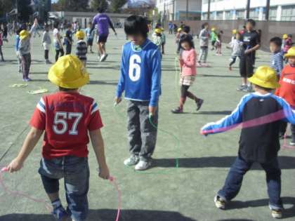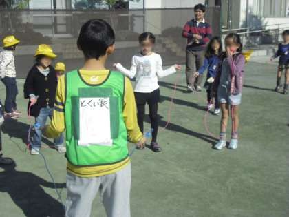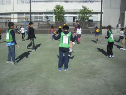 昨日の広場で発表した運動委員会のお友達が話していた通り、20分休みにビブスを着て校庭で短なわとびをするお友達を待っていました。