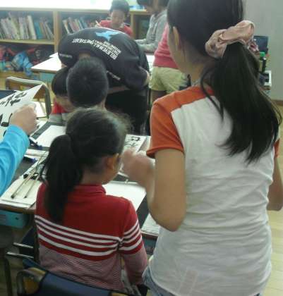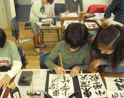 5年生が習字道具を持ってきて、2年生とペアになって、