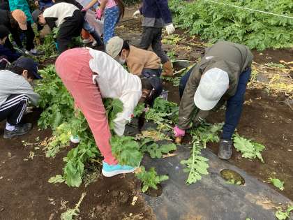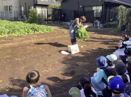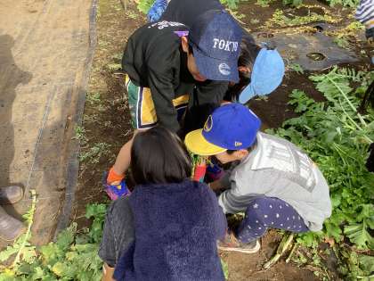 地域の農家さんのご協力のもと、大根抜き体験を行いました。農家さんから大根の詳しいお話や収穫のコツを教えていただきました。畑に並んだ立派な大根をみて子どもたちは大興奮!茎の根本をしっかり握り、大きな大根を力いっぱい引き抜くと、「とれた!」という歓声があがりました。一人では抜けないような大きな大根も友達と協力して抜く姿に子どもたちの成長が感じられました。収穫した大根は、家庭に持ち帰り、食べていただければと思います。この体験を通じて、世田谷育ちの農作物の良さを知る貴重な機会となればと思います。