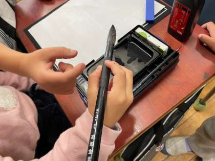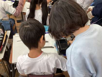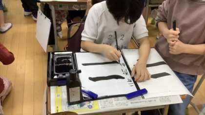 「どう使うんだろう。」「上手に書けるかな。」とドキドキしながら、3年生の教室に向かった2年生。用具の使い方やポイントを聞くと、実際に“二“を書きました。学習を終えると、2年生からは「楽しかった。」「3年生になって早く習字をしたい。」などと声が聞かれ、嬉しそうに自分の書いた半紙を持ち帰っていました。子どもが持ち帰った作品を是非見てください。