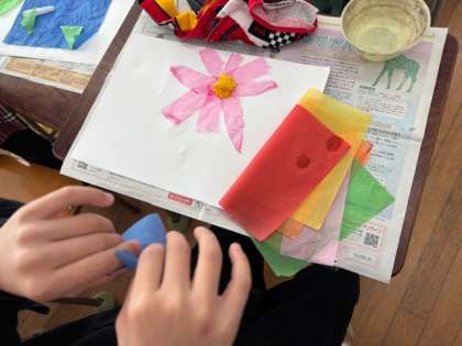 1年生の図工では、お花紙を使った絵をつくっていました。