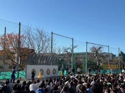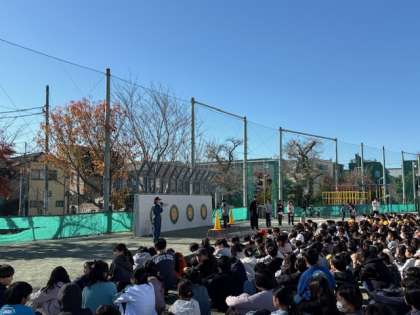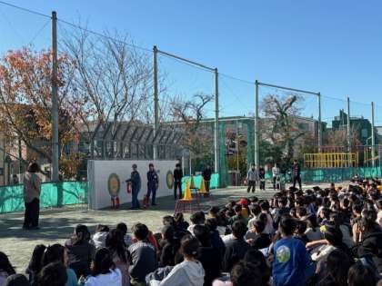 「火事だ!」と周りに知らせてから、6年生が実際に消火作業をする様子を下級生たちが見守りました。