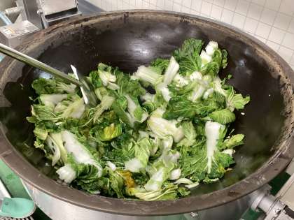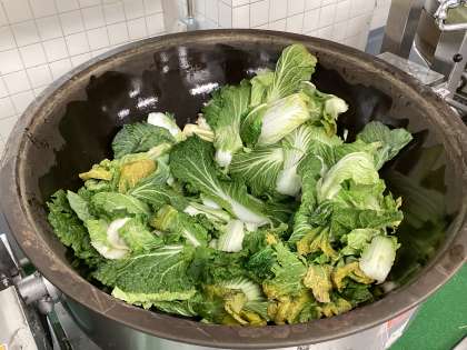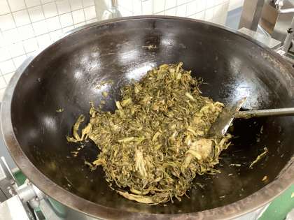わらを煮た後の回転釜を洗ってから野菜くずを炒めます。