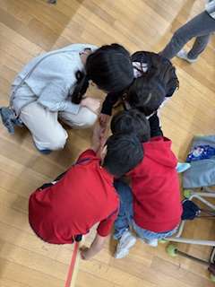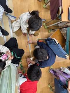 両手を広げた長さは何cmか、友達と考えを出し合いながら調べていました。