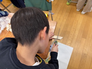 刃を入れる角度を工夫しながら、いろいろな形の木片が出来上がっています。木を固定させながら、慎重にのこぎりを動かしていました。真剣な眼差しが印象的でした。