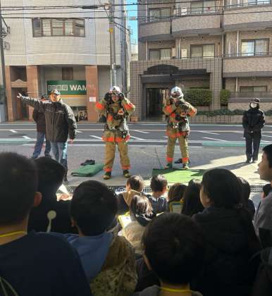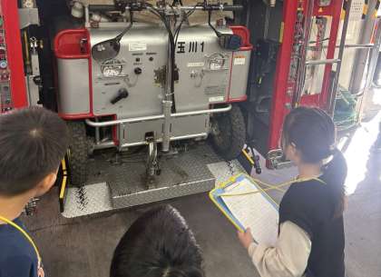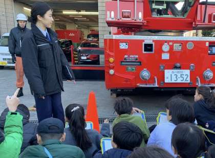 消防署では、消防士の方々が普段どのようなお仕事をされているのか、詳しく説明していただきました。子どもたちは、消防車の仕組みや、防火服の重さに驚いた様子でした。今回の見学を通して、働く人の思いを直接聞くことができ、地域の安全を守る消防士の方々への感謝の気持ちを深めることができました