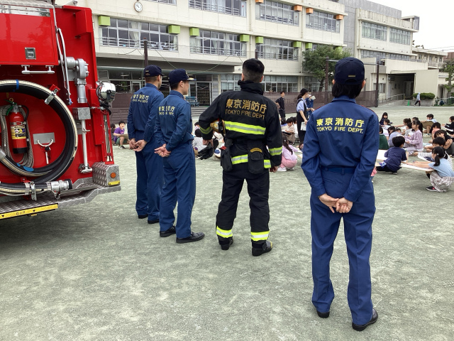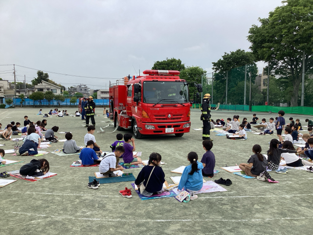 ここ数年、天気に恵まれなかった消防写生会。今年は曇り空でしたが、校庭に2台の消防車がきてくださり、子どもたちは消防車の大きさに目を輝かせていました。消防車を前から見たり横から見たりして、描きたい場所を選びました。教室の机と同じくらい大きい画用紙いっぱいに、クレパスを使って描きました。クレパスの次は、絵の具も使ってさらに華やかにしていきます。できあがりを楽しみにしていてください。