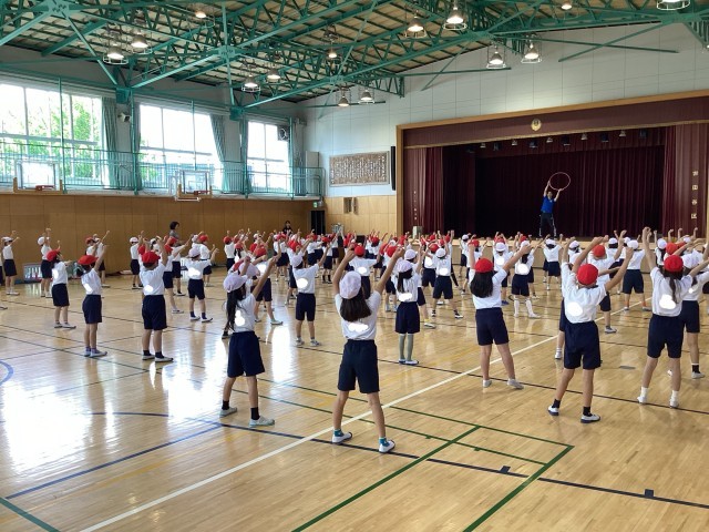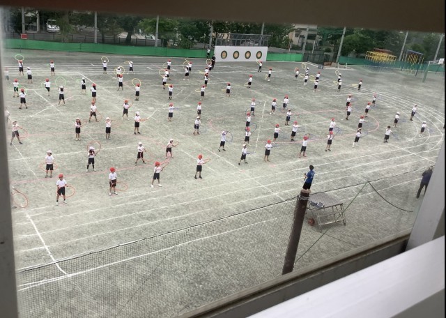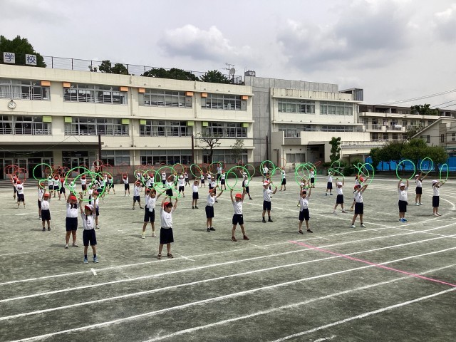 2年生の表現は、フラフープを使ったダンスです。題名は、「WAO!」です。題名の通り、みんなにWAO(ワオ)!と言ってもらいたいです。2年生の子どもたちは、